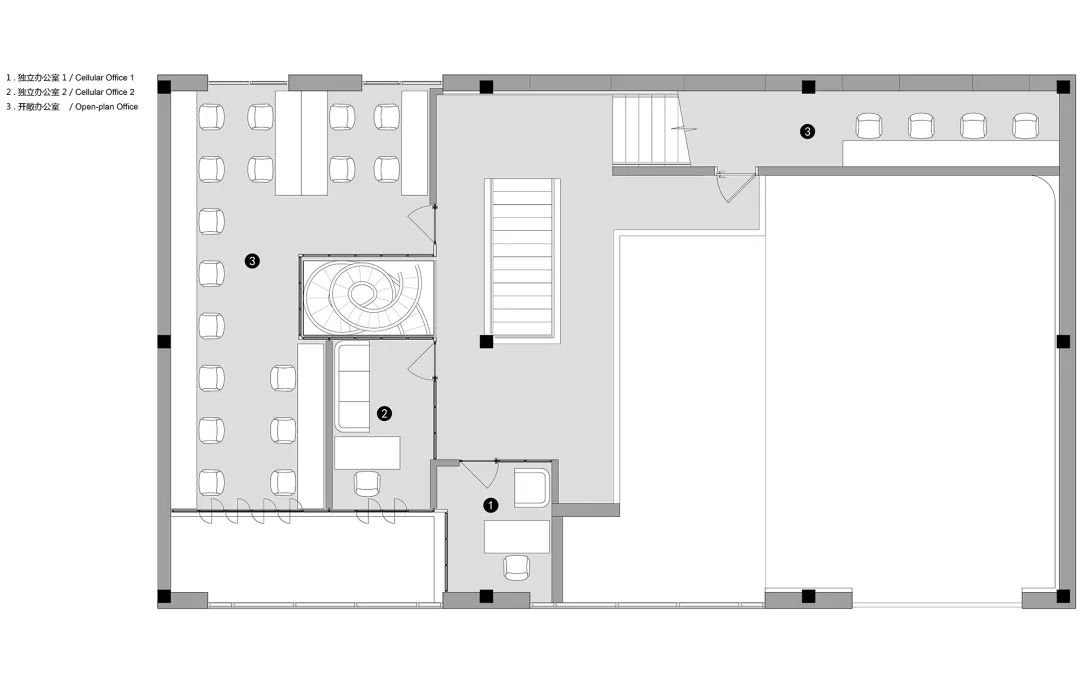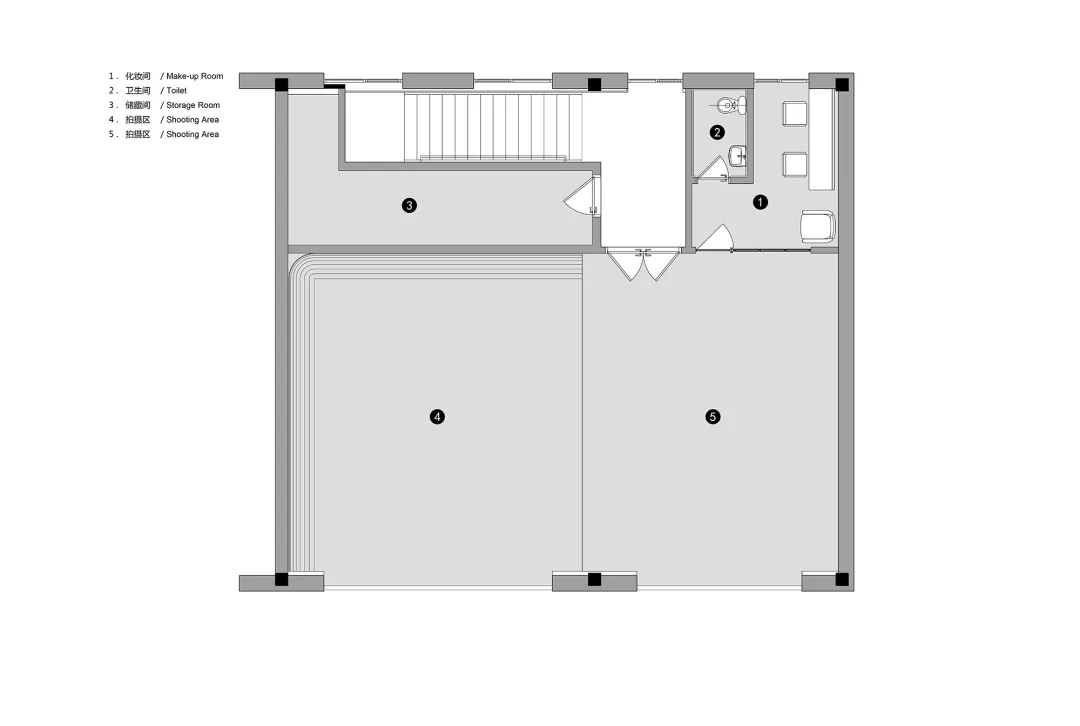 ASTUDIO攝影工作室位于CBD東側(cè)菁英谷文創(chuàng)園內(nèi),整體的設(shè)計風格融合了粗狂工業(yè)風和現(xiàn)代簡約風。原有建筑為雙層的廠房空間,這種大空間非常適合拍攝的需求。攝影師希望把這個大空間改造為兩個相對獨立的拍攝區(qū),并且有各自獨立的化妝間和出入口,從而可以同時進行兩場獨立的拍攝。UUA將原有的二層建筑在豎向上改造成為了三層的空間,其中第一層包含接待區(qū)和1號拍攝區(qū),第二層整體為辦公空間,第三層是2號拍攝區(qū),這種豎向上的分區(qū)保障了兩場同時拍攝的獨立性。