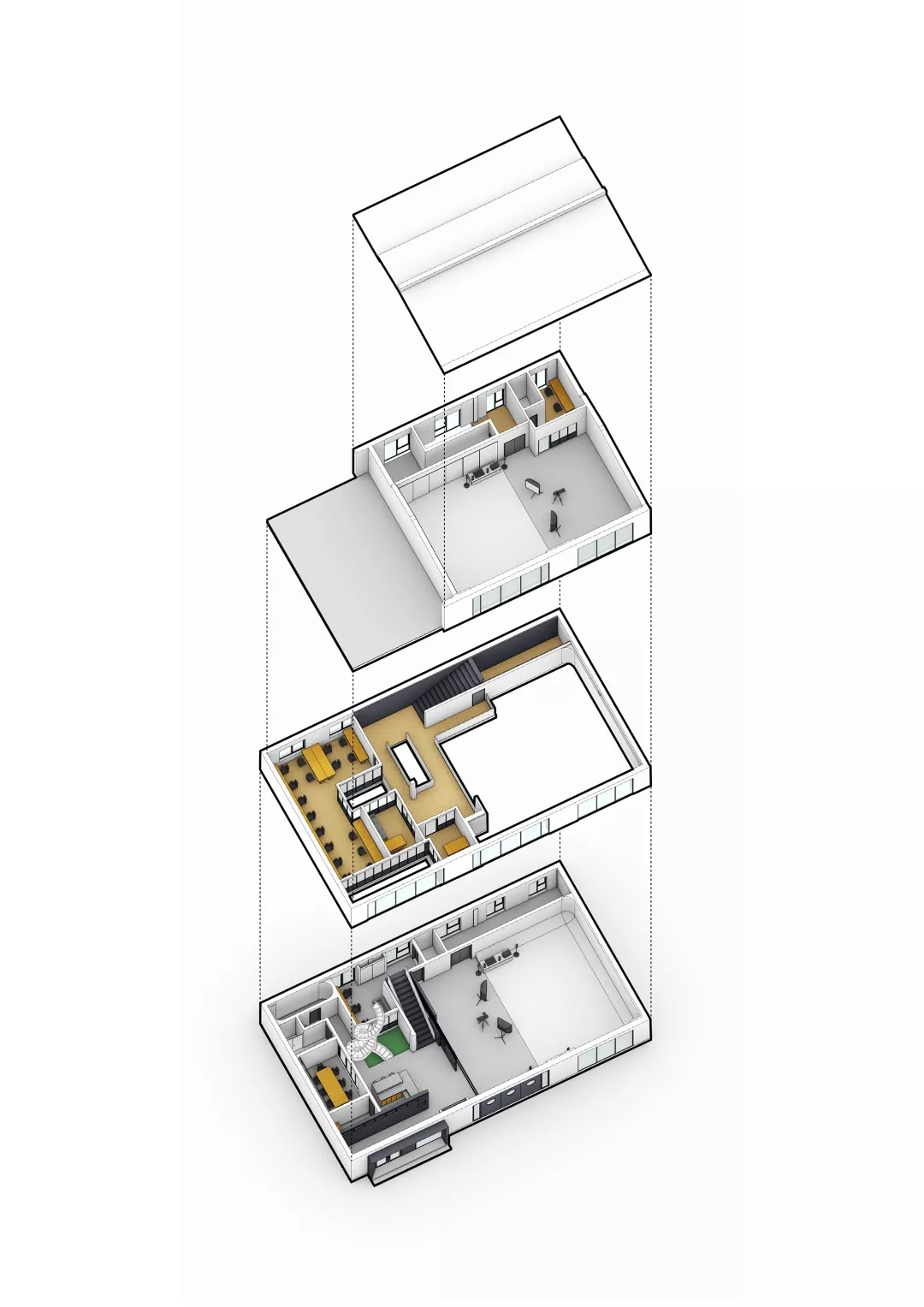 ASTUDIO攝影工作室是一個多功能的復合空間,UUA把拍攝、化妝、接待、辦公、會議、休閑等多種功能有機地融合在這個通高的廠房之中,空間緊湊又富于變化。拍攝區(qū)為最重要的功能單元,由于需要足夠的長寬高空間來滿足設(shè)置無影墻、布景布光以及拍攝距離等需求,所以設(shè)計師將一層的一半劃歸為1號拍攝區(qū),保留雙層通高的空間形式;另一半則加建出雙層空間,其中一層作為接待,二層作為辦公。廠房的三層因為原本具有足夠的層高,因此被設(shè)置為2號拍攝區(qū)。