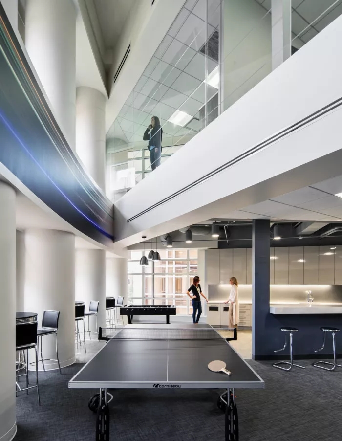 這里每一寸都為員工提供了一個支持他們成功的環(huán)境,依靠技術(shù)手段,打造鼓勵員工連接和溝通的氛圍。墻面白板、視頻會議室、各種空間和家具允許個人和團隊在辦公室內(nèi)的完美位置進行協(xié)作,當(dāng)然,如果想來一場即興的乒乓球比賽也未嘗不可。