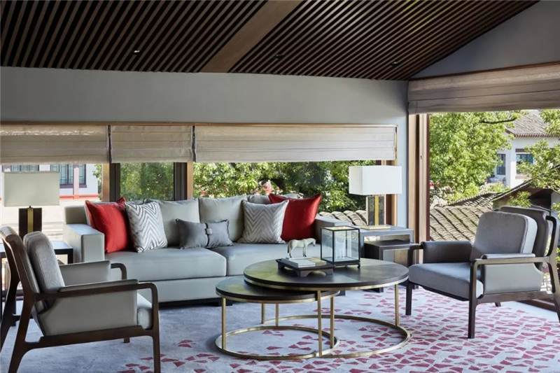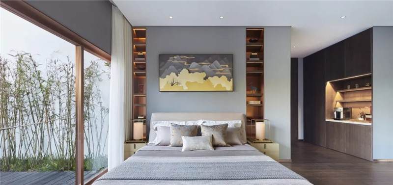 客房套間以現(xiàn)代簡約風范融入自然,呈現(xiàn)安寧愜意之境。設計師賦予其三面環(huán)景的奢享體驗,實現(xiàn)室內(nèi)與自然的對話,物器與光影的互動。
