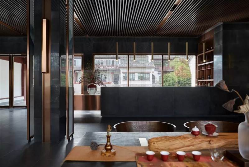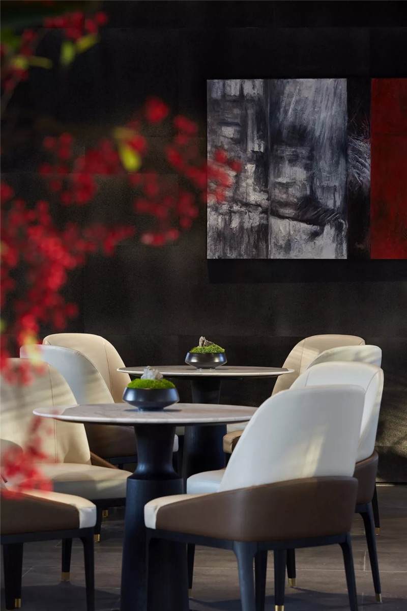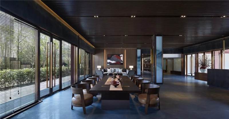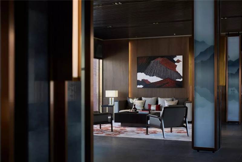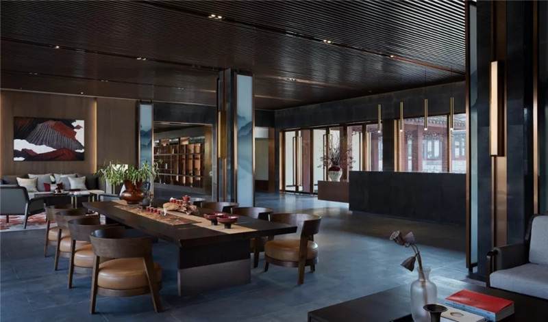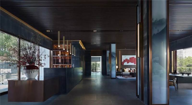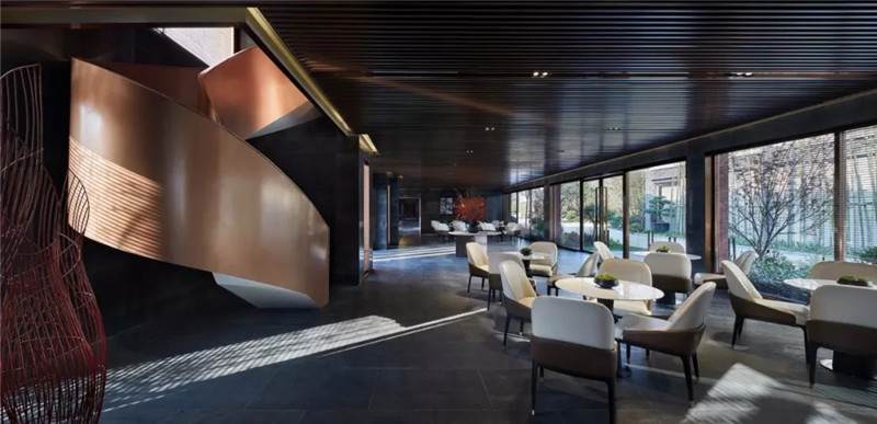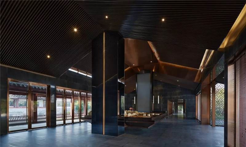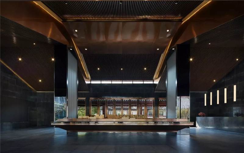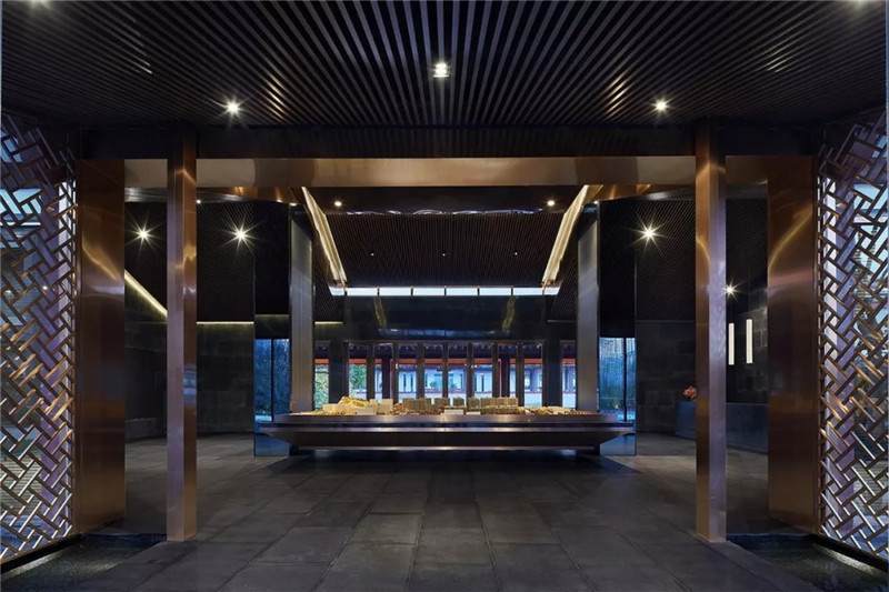 大堂內(nèi)注重材質(zhì)的克制與平衡,大面的黑色基底將儀式感與雄渾氣勢渲染而出。金屬鏤空格柵顯江南韻律,斜屋頂及頂端挑空區(qū)窗口,則是對傳統(tǒng)物態(tài)的解構與再造。剝開視覺表象,映射出來的是現(xiàn)代、東方、藝術、自然等內(nèi)核元素,給賓客無與倫比的感官體驗。
