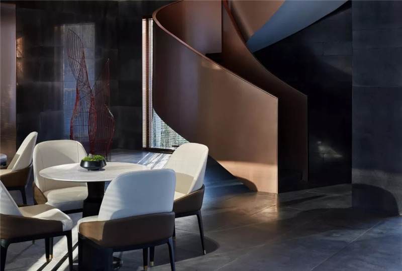 古銅包裹樓梯螺旋而上,功用與審美效果兼具。一隅而立的“蝶影”雕塑以曲線自然伸展,仿若蝶兒展翅欲語芬芳。二者既有體態(tài)上的匹配,又為空間增添了幾絲柔和與輕盈。