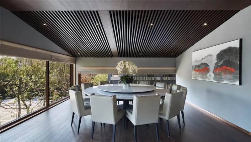 二樓設有兩間獨立包廂,供賓客攜友享用。保留古建筑原有傾斜屋頂,尊重格局而做設計,大道至簡,方圓之間,各得其妙。借由通透的落地窗引入美好景致,讓視線變得有趣,用餐更為舒適、自然。