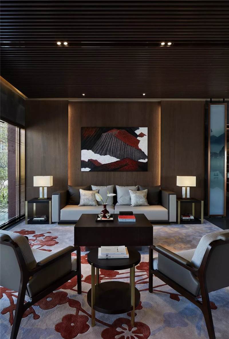 會客區(qū)處于中心茶臺兩端,對稱的手法、圍合的陳列、適宜的比例,實現(xiàn)多樣元素的碰撞演繹,剛?cè)岵?,飽含層次感。主背景木飾面嵌古銅,加上燈帶設置,顯得安靜而溫潤。