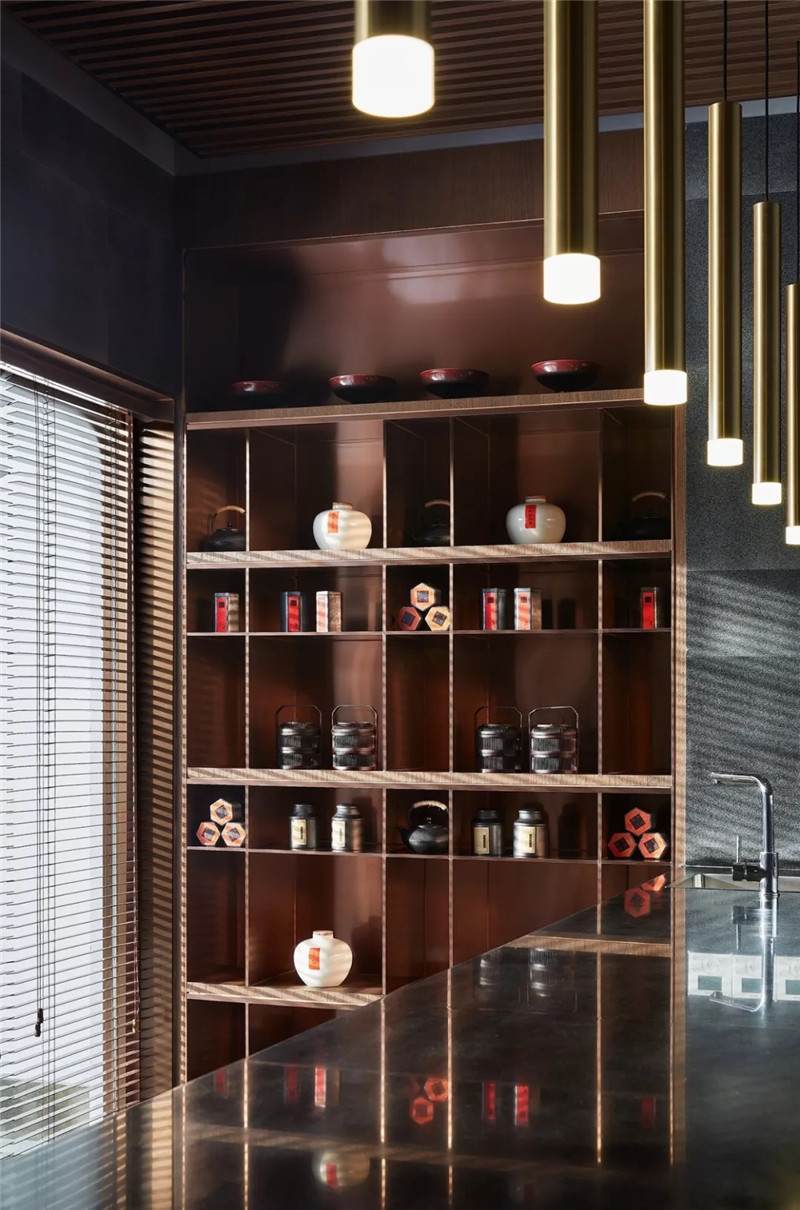 傳統(tǒng)古樸的根雕茶臺、日式絲織茶席,結合多樣材質(zhì)混搭,鋪展開一室古雅清愜。于此飲茶一甌,以裊裊升騰的水霧構就品茗論道的精神棲居。水吧臺與茶室相對,茶文化展示架使用木格與金屬層板相交設置,以其跳躍性突破常規(guī)。
