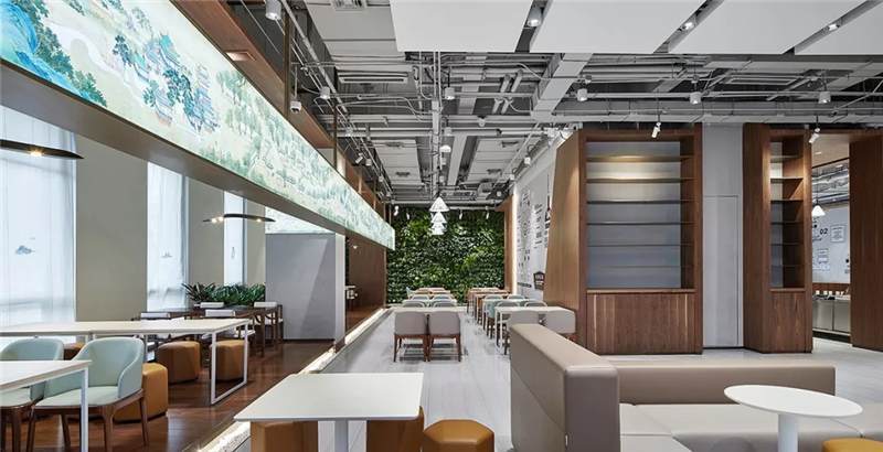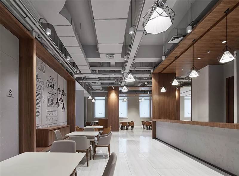 前廳左側(cè)穿越企業(yè)榮譽展示墻即是咖啡廳和用餐區(qū)??举|(zhì)家具圍合成不同的半私密性空間,黑色幾何線條吊燈及長條形中國傳統(tǒng)園林山水飾面燈箱分別營造出現(xiàn)代與古典相融的用餐氛圍。