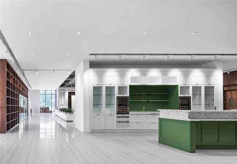 前廳大堂采用高挑空結(jié)構(gòu),用大尺寸純色人造石雕刻工藝打造前臺及LOGO背景墻,背景墻后設(shè)置墻體與東易日盛高端家裝高科技產(chǎn)品一體化展示區(qū),右側(cè)設(shè)置白色穿孔鋁板樓梯配以彩色階梯直達(dá)二層展廳,樓梯平臺以木飾面板點綴綠植打造成休憩待客區(qū),整個大堂接待區(qū)營造出現(xiàn)代,開放,包容的氛圍。