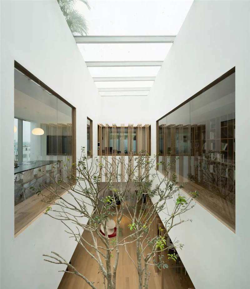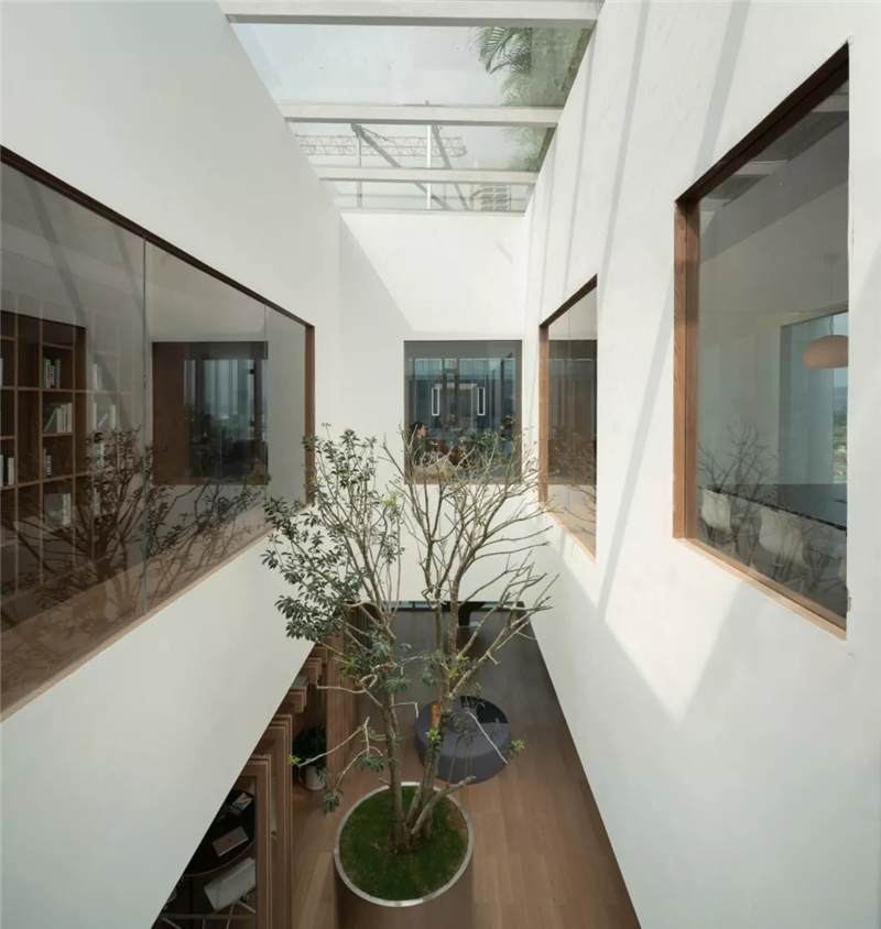 于是在空間設(shè)計上,盡量打破室內(nèi)外空間的界限,內(nèi)與外的空間景致相互流通。地下一層為洽談?wù)故究臻g,室外為下沉庭院。大面積玻璃的運用,將庭院景觀引入室內(nèi)。并將通向一層大堂的樓梯,設(shè)計成朝向庭院開敞的大樓梯,可停留、可休憩,可觀賞與感受庭院的景致、光影的變化。而在四層和五層,則借鑒嶺南建筑中的天井院落空間,設(shè)計一個貫通兩層的屋頂采光中庭——天光從上流瀉而下,灑在四層中庭的景觀樹上、滿溢在空間中,使室內(nèi)產(chǎn)生一種宛若室外庭院的錯覺。