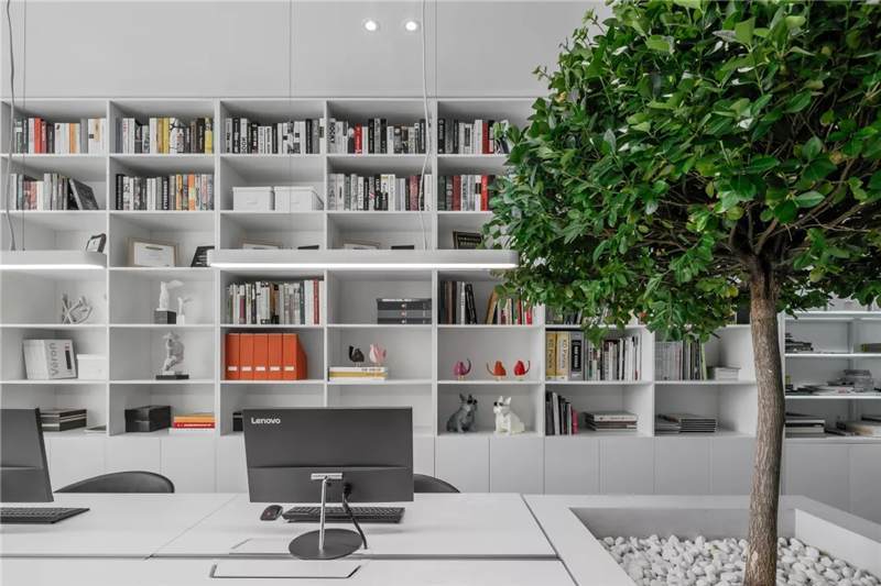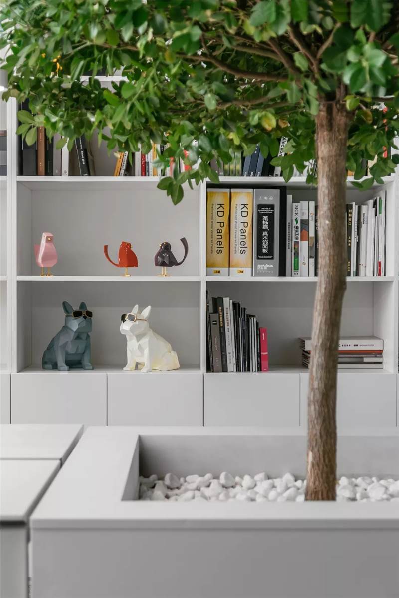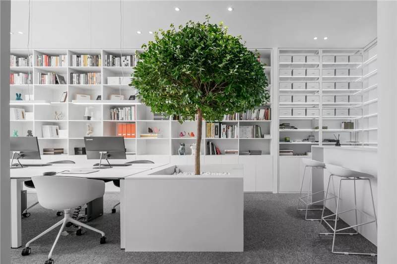 在這里,未知的一切與既有的常識(shí)記憶產(chǎn)生傳導(dǎo),想象思維的觸角開(kāi)始蔓延。小株綠樹(shù)分隔出挑高的白色高座式二人桌,提供了一種更為隨性、更利于面對(duì)面交流的辦公形式。