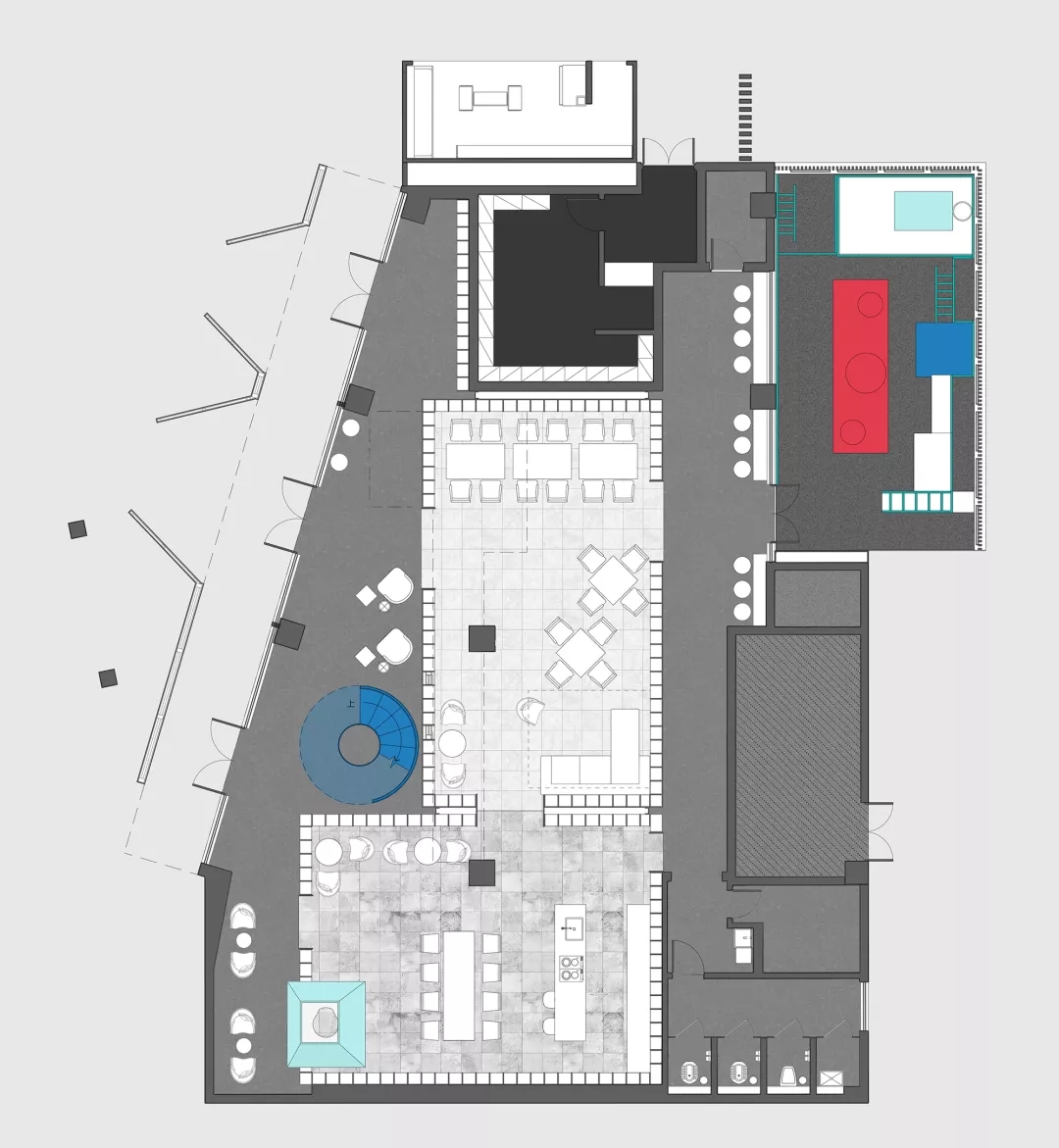 現(xiàn)場是個(gè)不規(guī)則的平面,如果排除未來可復(fù)制性,就著形狀設(shè)計(jì)并無不可,但這就缺乏了示范性意義。設(shè)計(jì)師按照客廳研究成果,在這個(gè)不規(guī)則平面最大極限設(shè)置了三個(gè)盒子,一個(gè)是功能性的,一個(gè)是社交性的,一個(gè)是女性的。如果把不規(guī)則的場地看成是一座城,這三個(gè)盒子就是內(nèi)城,而他們之間不規(guī)則的剩余空間可以自由定義的場所。