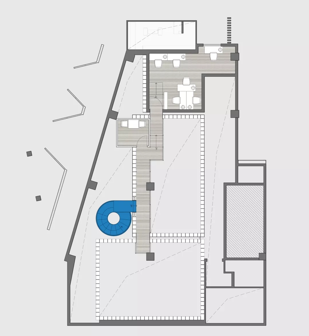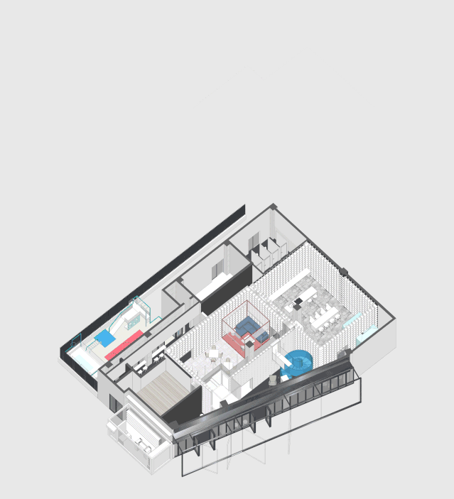 我們設(shè)計(jì)了一個(gè)夾層走廊隱藏在書架上.在課題研究中如何利用層高一直是房產(chǎn)商關(guān)心的,以我的實(shí)際經(jīng)驗(yàn),凈高2.1米仍然具有一定舒適度。在本案中,原本懸在社交盒子上的麻將房因?yàn)橐粯菍痈哌^低無法成立,于是我們直接切斷,形成一個(gè)小陽臺(tái)作為暗示。
