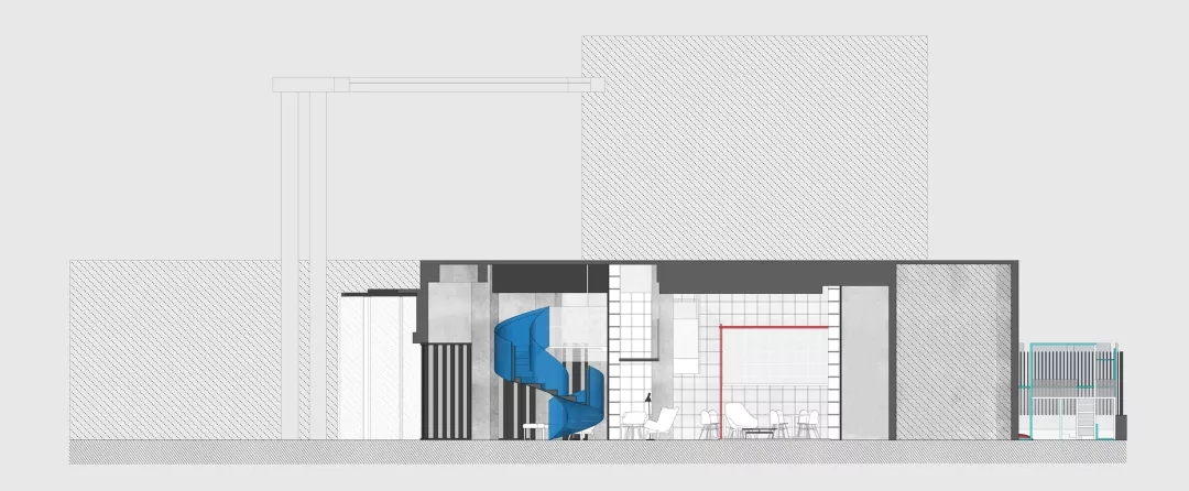 我用蒂芬妮藍(lán)閱讀屋作為女性盒子的中心,與此呼應(yīng)的是入口可見的卡萊茵藍(lán)螺旋樓梯,以及盒子背面室外的明黃色兒童活動(dòng)場地。他們精致地鑲嵌在有些迷離模糊的空間中成為點(diǎn)睛之筆。如果社區(qū)客廳藏在陳詞濫調(diào)的商業(yè)里面之后,就失去了示范作用。有空客廳的立面就是一個(gè)打開的盒子,高4米的半開門是穿孔鋁板制作的,形成了Wutopia Lab標(biāo)志性的半透明界面。你能從這里隱隱約約的窺看到,溫暖的燈光,明亮的藍(lán)色,和孩子的笑聲。