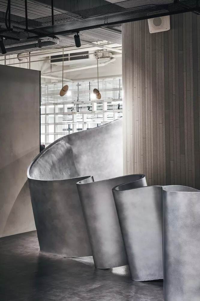 創(chuàng)意是無限,沒有邊界的。是一條線、亦是線聚集轉(zhuǎn)化而成的曲面。直線,是思考的軌跡。曲面,是每個(gè)創(chuàng)作的轉(zhuǎn)折,線條的動(dòng)靜之間,串聯(lián)了空間,刻意保留基地原貌的原質(zhì)肌理,植入了新的設(shè)計(jì)元素,呈現(xiàn)粗曠和細(xì)致的沖突美,來表達(dá)品牌精神:前衛(wèi)、年輕、精致、優(yōu)雅。充滿雕塑感的柜臺(tái),佇立于公共空間中充滿風(fēng)采,勾勒新穎且醒目的企業(yè)形象。
