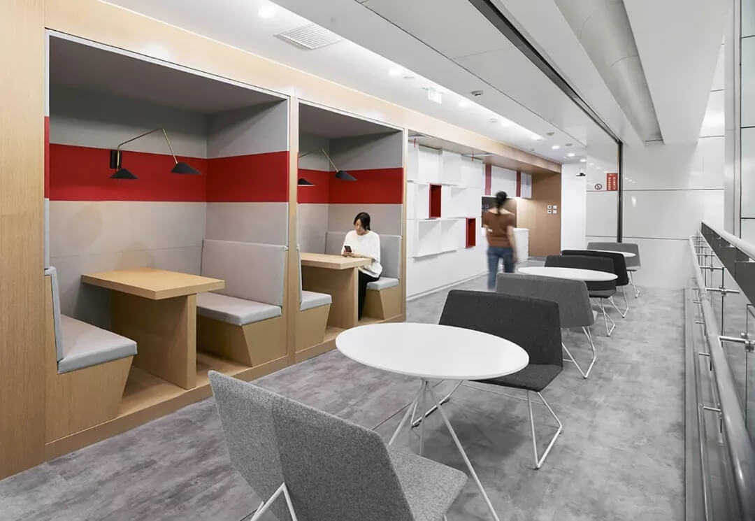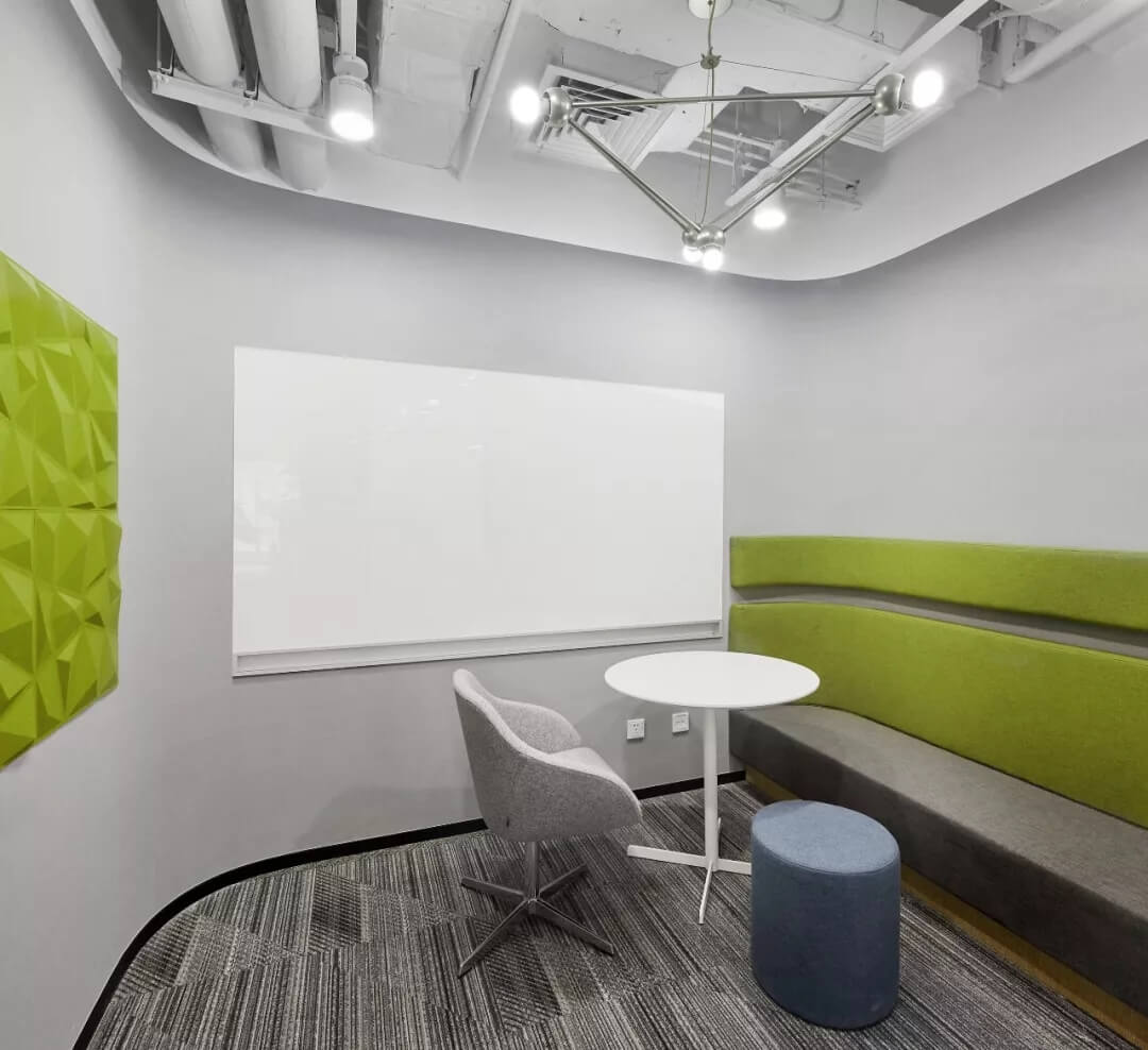 核心筒是整個辦公空間的混合功能區(qū),頻繁產(chǎn)生互動式交流,頭腦風暴,也是重要的會客及自由移動式辦公區(qū)。在設(shè)計上,艾迪爾設(shè)置了滿足不同會客需求的休閑討論區(qū),連接著標準辦公區(qū)和公共通道,營造多層次交流氛圍,體現(xiàn)商湯科技開放包容的文化價值觀。