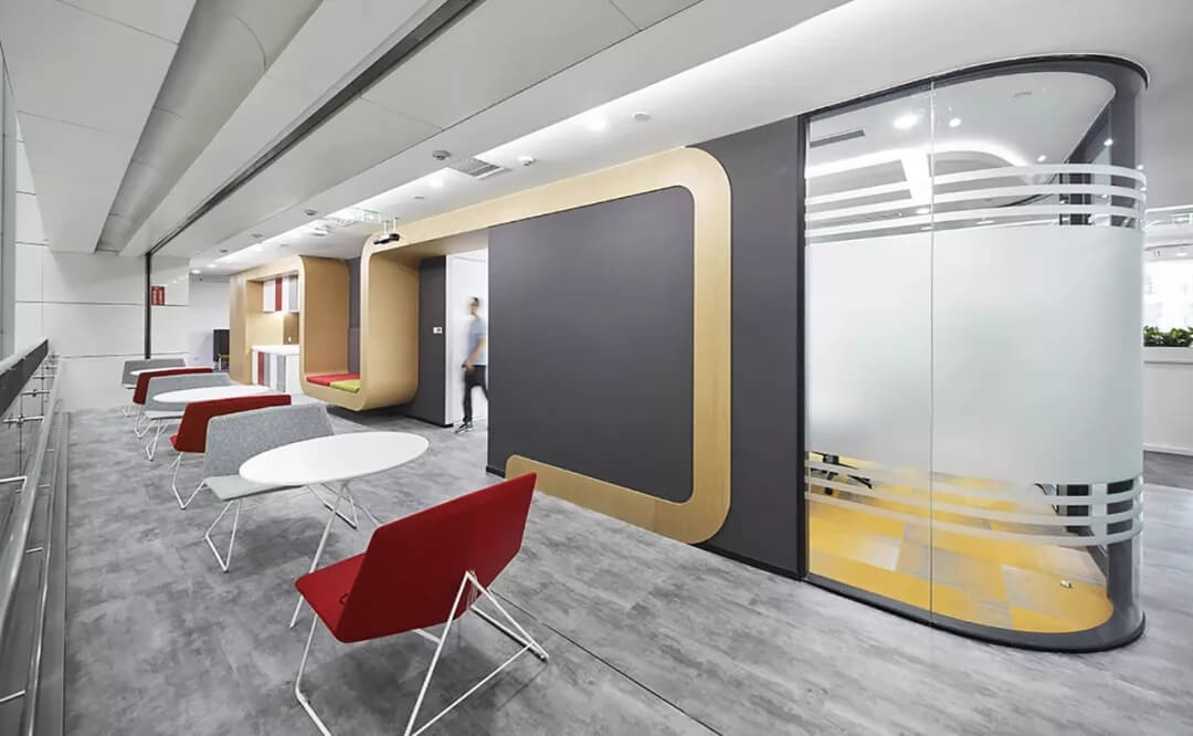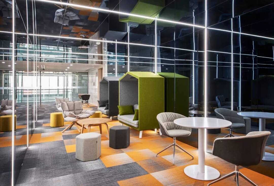 在軟裝設(shè)計上,該區(qū)域家具軟裝及墻壁,選擇明快的色調(diào),展示青春活力,并且用黑色烤漆玻璃內(nèi)嵌燈帶的方式營造氛圍,透著數(shù)字化和科技感,表現(xiàn)商湯在數(shù)字時代的不同場景中,所呈現(xiàn)的多元化和創(chuàng)新性。