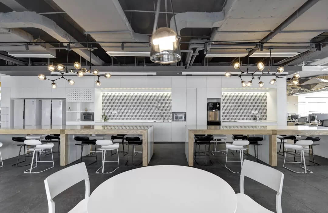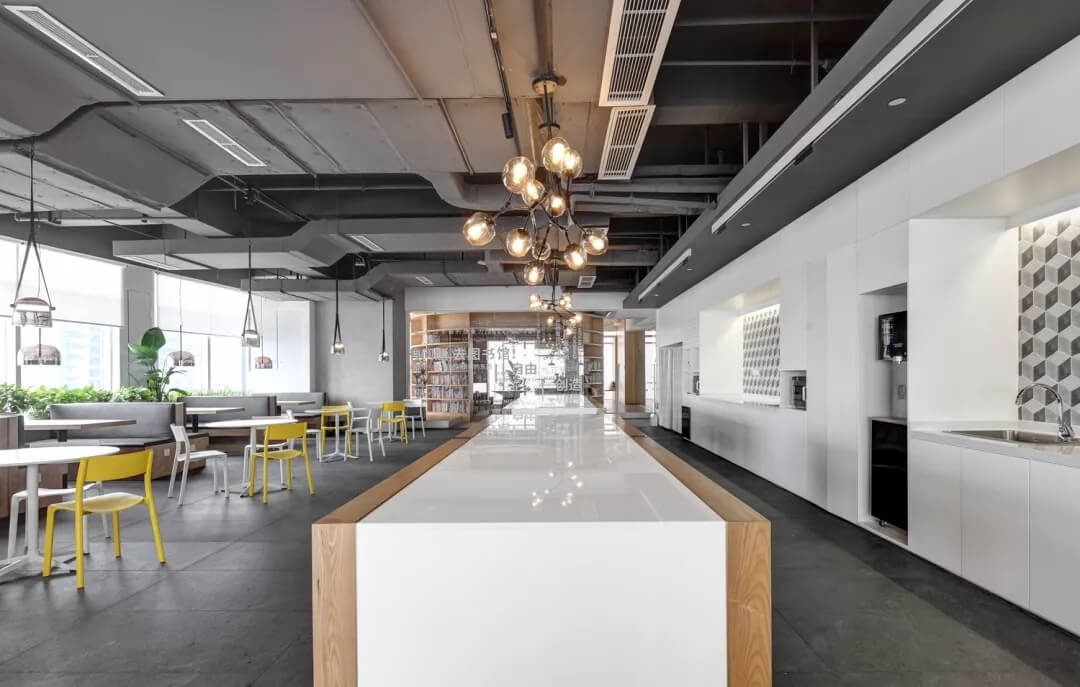 茶水區(qū),同時也是為員工準備的小型餐廳,水泥質(zhì)感的休閑餐飲空間更加穩(wěn)重大方,吧臺的設(shè)計可為員工提供輕食的烹飪,以及簡食的加熱。