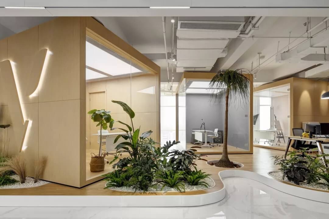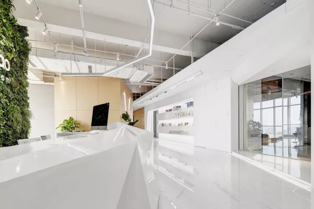 門廳接待處背景墻設(shè)計采用真實植物進行裝飾,構(gòu)成生態(tài)的室內(nèi)空間,提升空間使用的舒適度。前臺的設(shè)計運用體塊切割的方式做成不規(guī)則的形狀,以到達從不同的角度觀看到的場景都處于變化的狀態(tài)當中。
