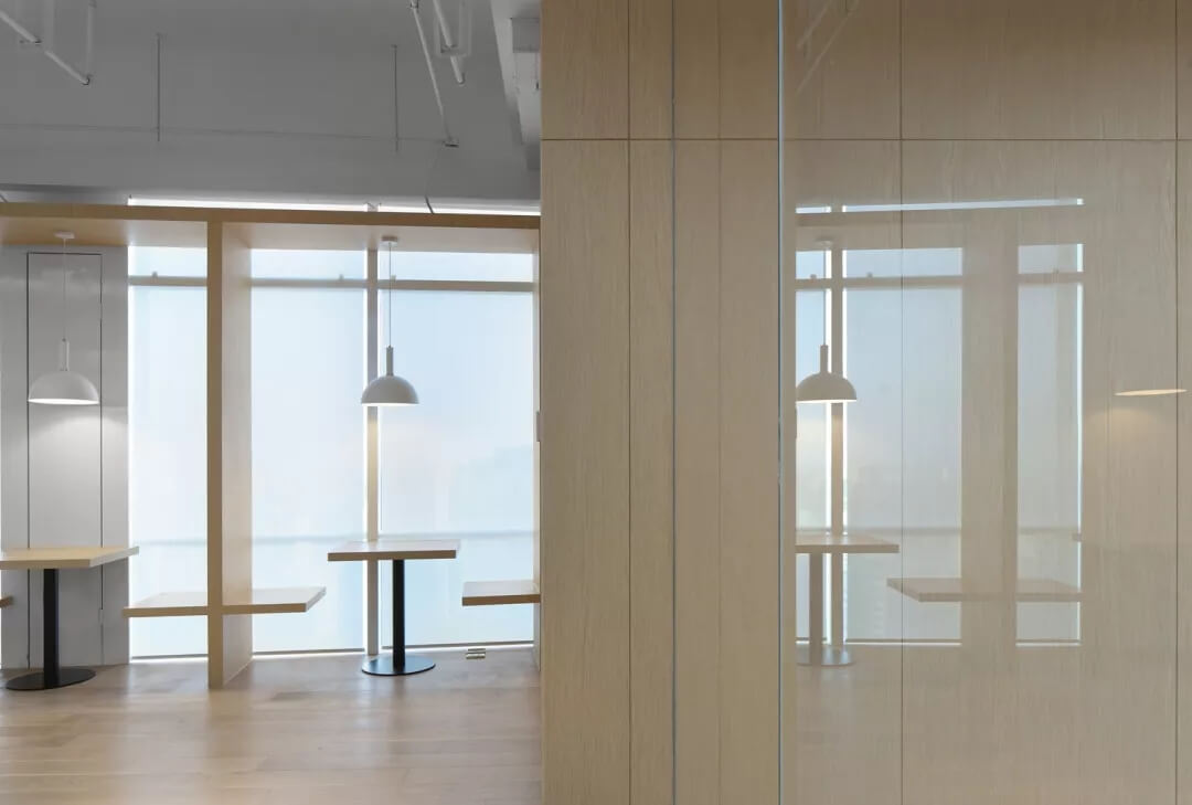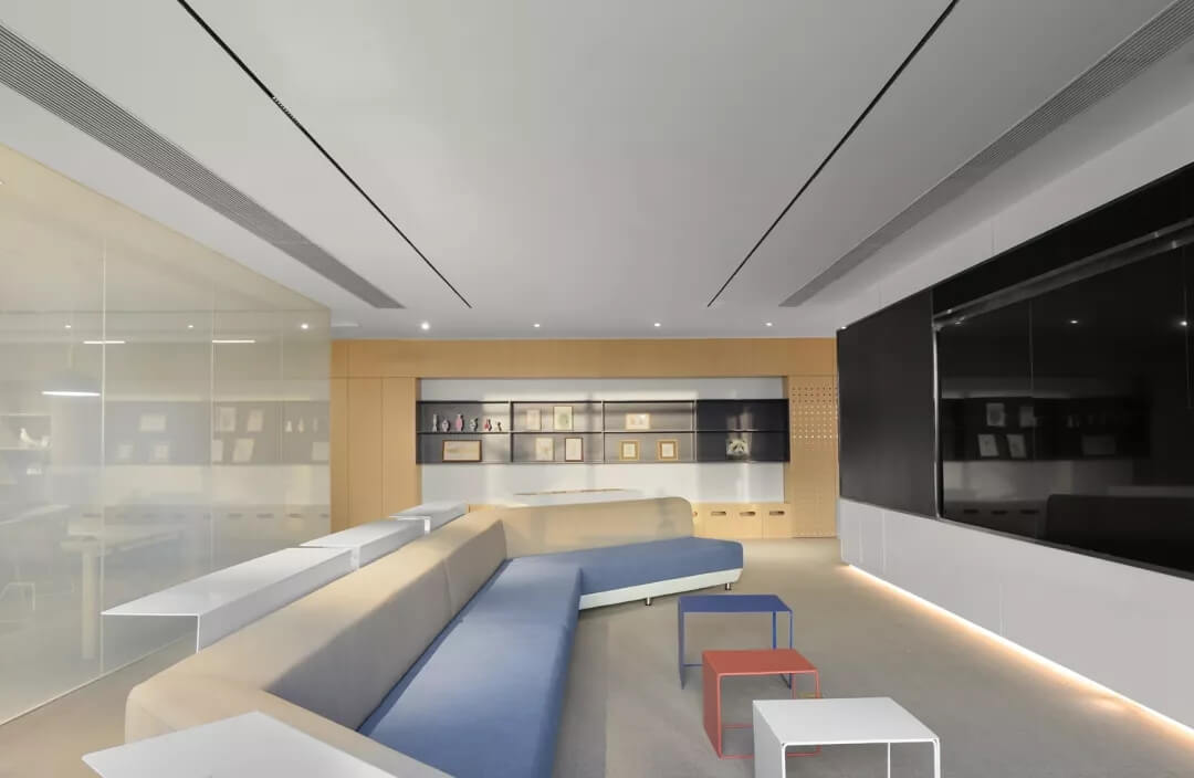 辦公區(qū)的設(shè)計打破了傳統(tǒng)辦公室嚴謹有序的陣列式布局方式,而在全景落地窗前設(shè)計出日式風格的“榻榻米”造型,滿足了使用者對于空間多元化的體驗要求,同時分隔空間,局部抬高的空間變得生動且有張力,大大提升了空間的立體感。