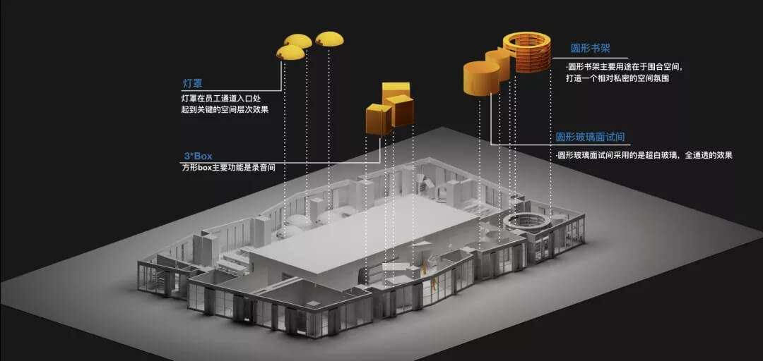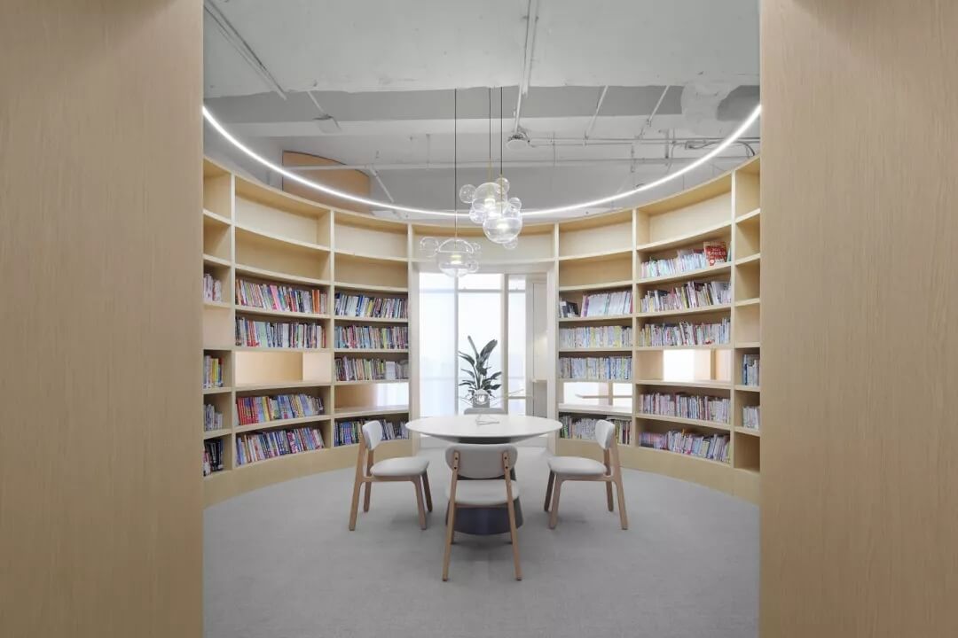 空間的劃分當中,“圓形”起到了至關(guān)重要的作用,包括培訓(xùn)室和圖書閱覽室的設(shè)計,運用圓形圓潤的特質(zhì),柔和的將空間劃分,從而使空間的運用上富有彈性,動線的流通更加靈活。位于西北角的圖書閱覽室,是整個室內(nèi)空間體量最大的一部分,同時也是此次設(shè)計亮點之一,它可放大約3000本書籍。