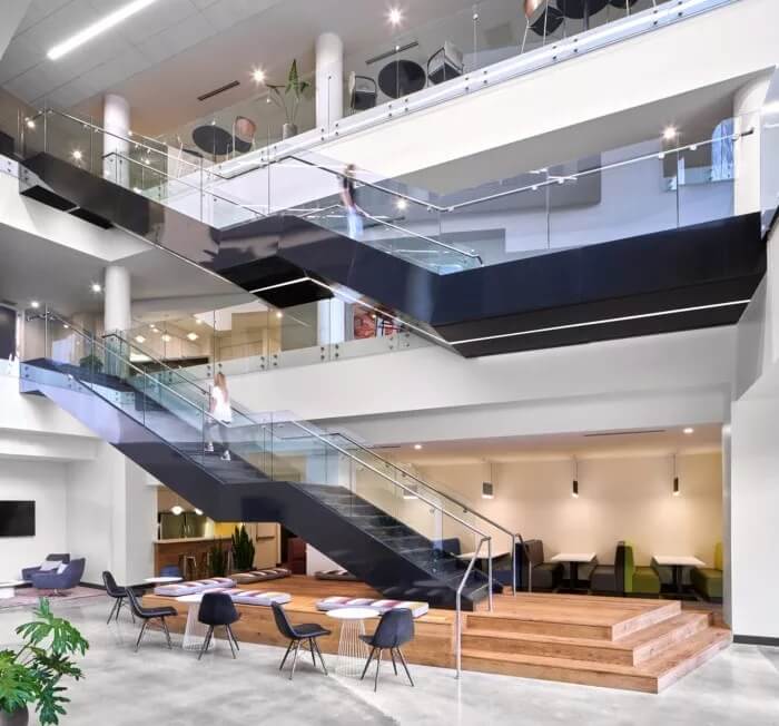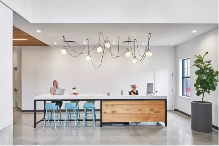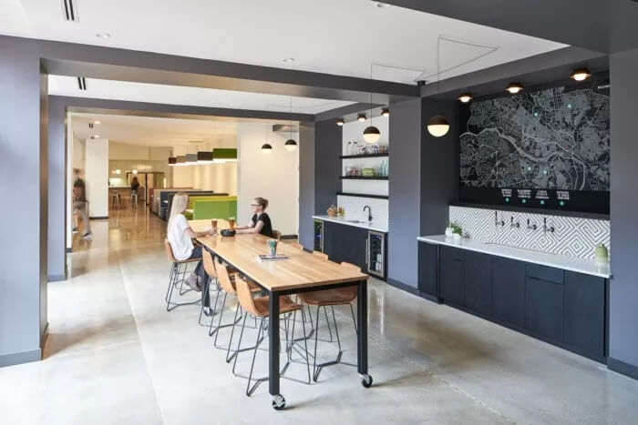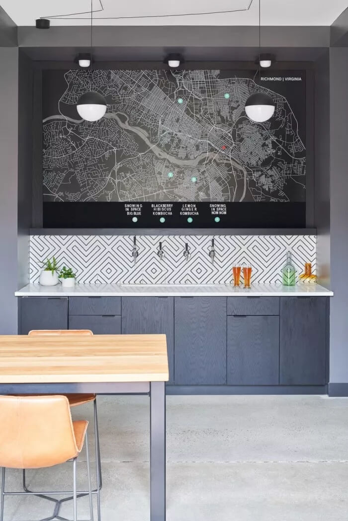 曾經(jīng)被濫用的中庭被重新構想成該機構的心臟-充滿活力的會議區(qū)和一間酒吧,設有來自里士滿地區(qū)的旋轉(zhuǎn)水龍頭。大堂取代了傳統(tǒng)的bun堡般的接待臺和獨立的休息區(qū),而是變成了一個畫廊—充滿活力,動感十足,并嵌入了里士滿的性格。還有接待處?那個也被定制的鋼制桌子代替,該桌子可以兼作員工的共同工作空間。