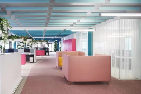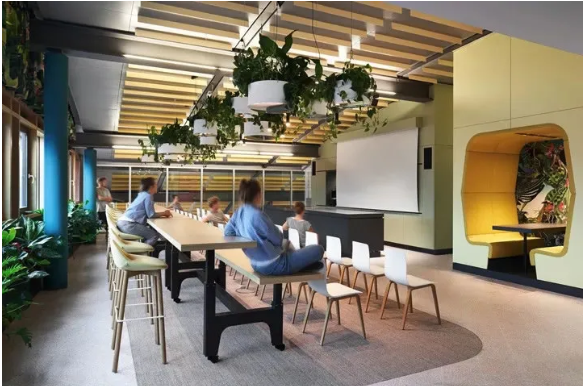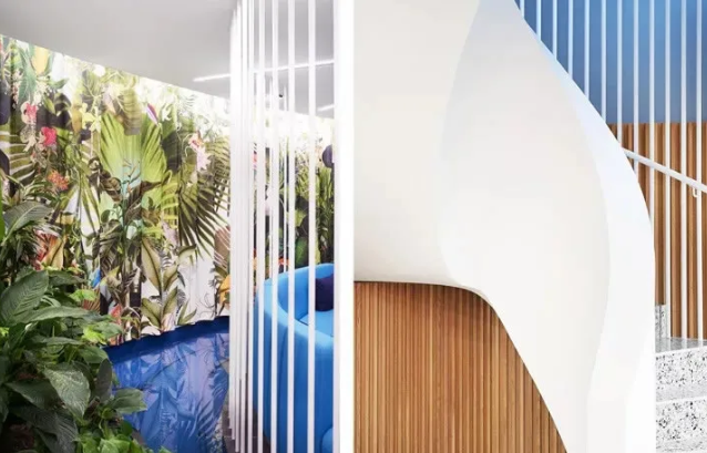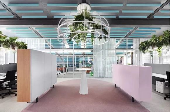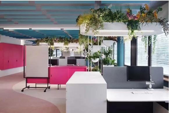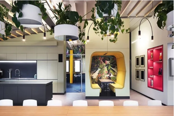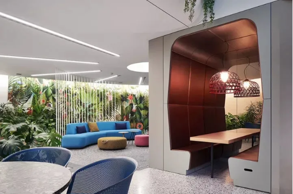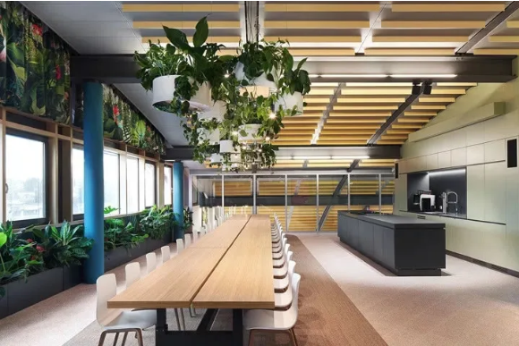 首先,設計團隊為這處工作場所增添了2100個超級盆栽植物。綠植能產生良好的情緒、降低精神壓力、促進創(chuàng)新、提高績效。此外,綠植還能改善空氣質量、營造健康環(huán)境,并起到降噪的作用。它們只需定期澆水就能保持茂盛狀態(tài),因此深得人心。室內盆栽植物具有強大的正能量。自從加入了這些綠化,室內濕度不僅從18%增加到44%,讓人們的體感非常舒適,連員工的病假都減少了一半!