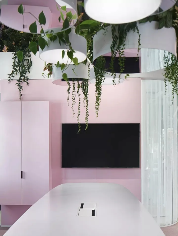 工作區(qū)采用中性色設計,利于專注工作。淡粉色的走道是真正的情緒助推器,它喚起了員工之間的情感共鳴。精心布置的水源和雅致的燈光設計有助于帶來更愉悅的心情。熱帶壁紙與柔軟的沙發(fā)和小圓桌塑造了一個熱情洋溢的活力氛圍。