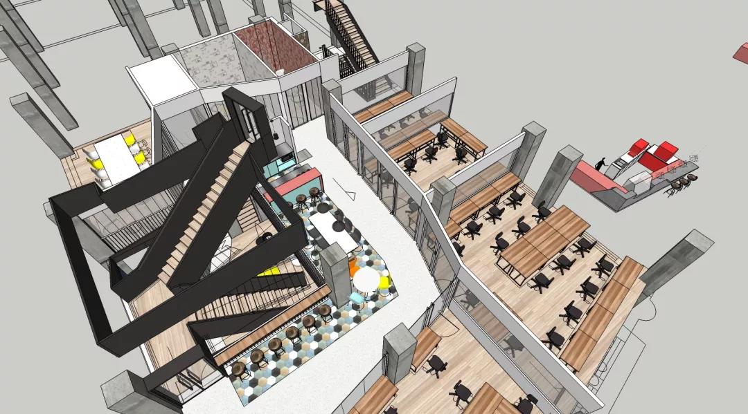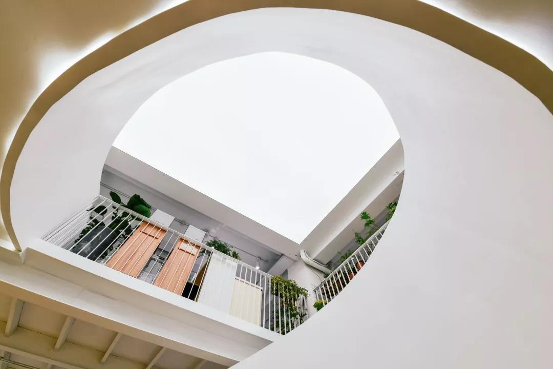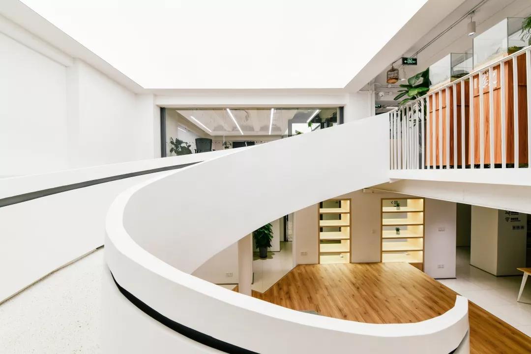 整個空間最大的視覺中心便是中庭里那個“刻意”彰顯存在感的樓梯,優(yōu)美的弧線激發(fā)并引導著大家探索上層空間的欲望。在最初的方案中,它其實并不是曲線,而是剛毅的直線,我們認為直線的迷人在于它的簡單、坦誠,棱角分明且封閉的做法讓它如雕塑一般矗立。