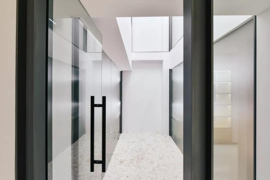 出于功能的需要,我們不得不在空間中加入隔墻,但為了讓老房子的肌理更加清晰,隔墻在與天花線腳的交界處切割為線腳的形狀,令原有天花線腳在視覺上保持連續(xù)。新置入的墻也一再被簡化,只有片段的玻璃、白墻、鋼柱直接裝在舊有構筑上。同時,為了盡可能減少干擾視覺的繁瑣因素,我們對細節(jié)反復推敲,讓每一處純粹到極致。