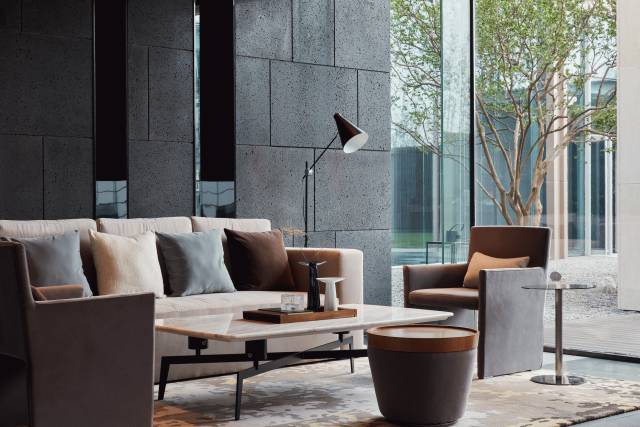 深灰色意大利火山石與柔和的沙發(fā)茶幾相得益彰,互為映襯。而光線照射進來更是活躍了整個空間,落地窗外便是庭院。水景區(qū)域一只白天鵝正在梳理羽毛,而水畔一側(cè)的休息區(qū)域更是增添了一縷閑情逸致,營造一種靜謐愜意的氛圍。