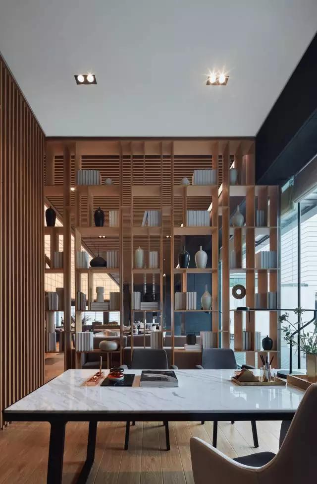 VIP區(qū)域原木色書架、豎向的木百葉有效阻隔區(qū)分空間,與周圍關(guān)系相互連接又互不打擾,形成半開放式的私密空間,整體保證了空間的互動性與獨立性。在這個“書卷留白筆墨濃”的區(qū)域,營造出靜心一隅,構(gòu)筑具有人文氣息和品質(zhì)感的氛圍。