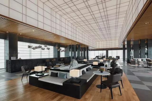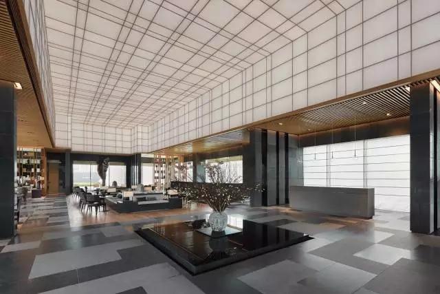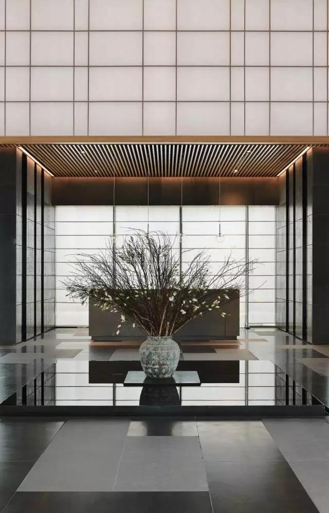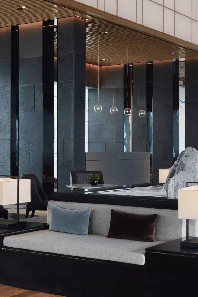 借由東方園林式的假山,打造出“未若柳絮因風起”的雪景,美如水墨畫、細膩至極。這與圍繞式洽談方式布置相結(jié)合,巧妙處理好空間形態(tài)和陳設(shè)之間的關(guān)系。大尺度挑高設(shè)計,加上頂部有序交互的線條,讓空間極具延展性,通透敞亮的照明效果搭配藝術(shù)性燈光點綴,使整體氛圍更顯大氣與品位。該空間通過主體、功能位置、通透的序列式的立面關(guān)系,自然分割空間視線,同時又實現(xiàn)了將光線引入到室內(nèi)的最大化。