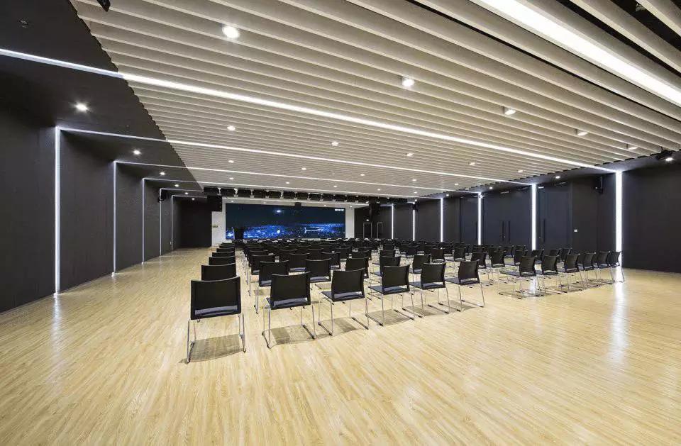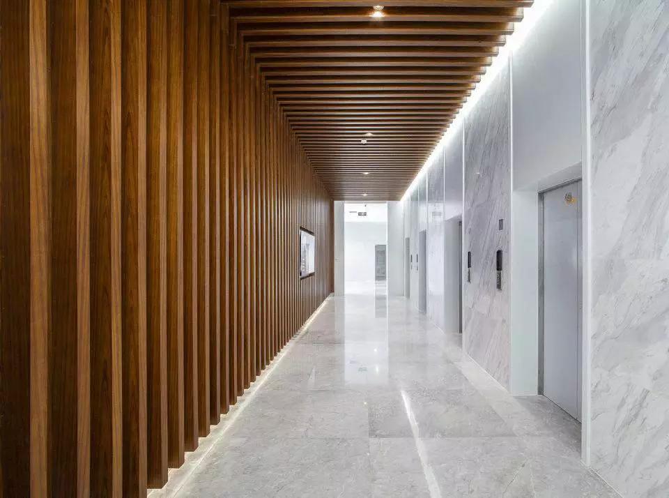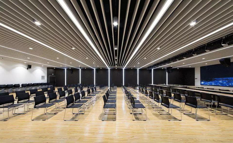 不同的空間內(nèi)容對應不同的材質氛圍,從色彩到質感,再到意象化的裝飾,我們依據(jù)大堂、會議、休息室、中庭等不同空間尺度與空間內(nèi)容營造新穎豐富、恰如其分的空間氛圍。溫暖的木色、混凝土板、白色大理石和白色乳膠漆為主要材料,其中報告廳大異其趣,優(yōu)雅高貴的深灰色布藝軟包與報告廳的相對集中和封閉性相得益彰。我們依托原有建筑空間序列,如大堂-電梯廳-等候區(qū)-多功能廳-VIP室-展廳,調(diào)整改變室內(nèi)設計的溫度與濃度,為原本純功能理性化的空間組織蒙上一層魅力面紗,讓功能化的“經(jīng)過”變?yōu)橐淮尾簧岬鸟v留與感受。