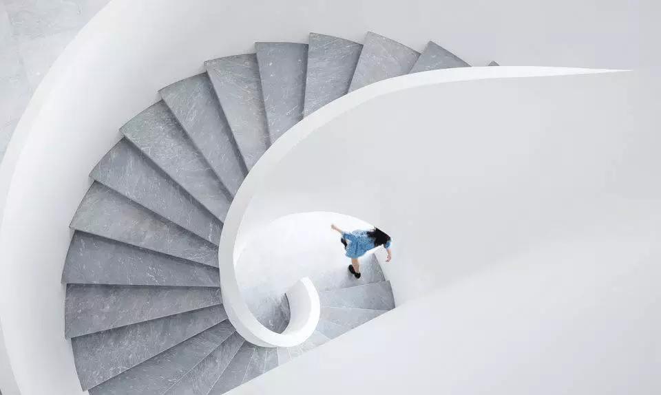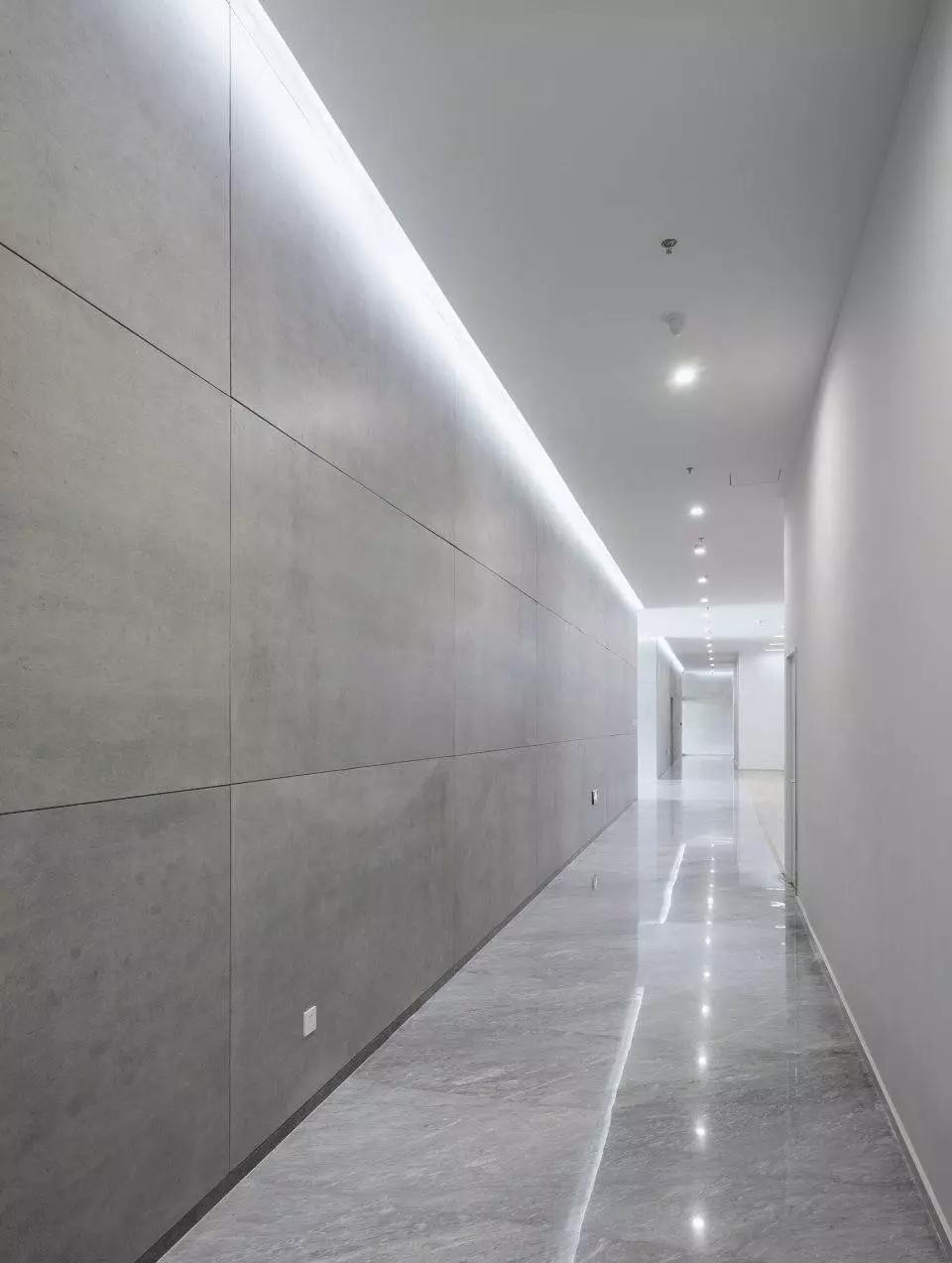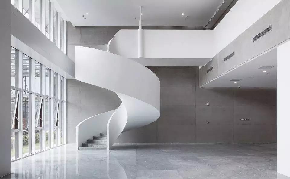 從中庭的自然光到室內(nèi)的人工光,大廈的光影在豁然開朗和細致入微之中不斷變換。中庭必須和天空有所交流,尤其是霧霾肆虐的今天,藍天顯得特別稀有,在中庭上方加蓋玻璃幕墻為上策。流空素影正翩翻,使得存在于強烈靜態(tài)空間體驗中的人又能同時感受到光影與云卷云舒的動態(tài)變化。在典型的辦公樓層,小型私人會議室從中庭立面懸挑而出,并錯落有致,打破了中庭的單調(diào),并增加了最小辦公空間的面積。一側的螺旋樓梯飄逸靈動,用混凝土演繹出的獨特輕薄感如風裳皎立,引辦公的人們靈感興發(fā)。