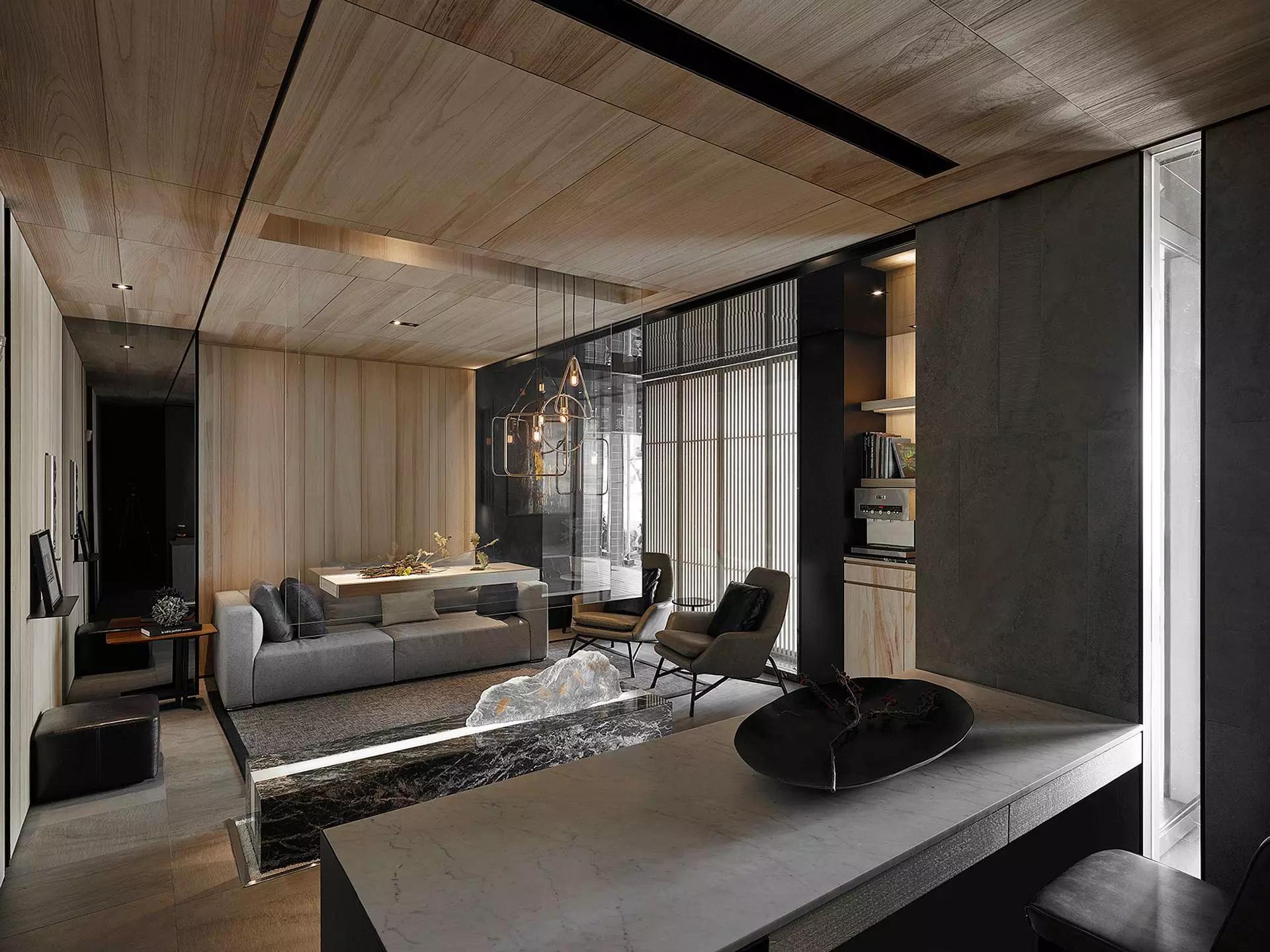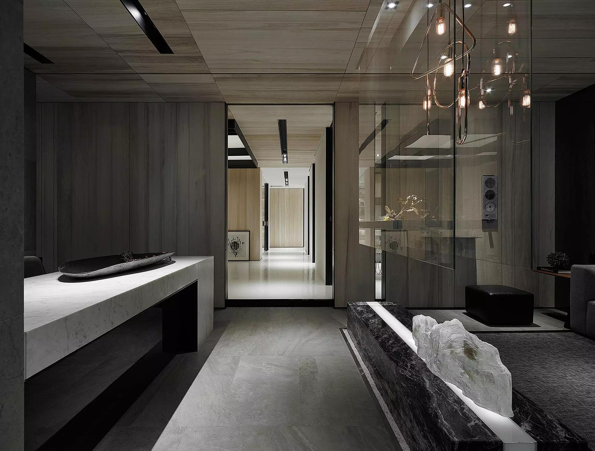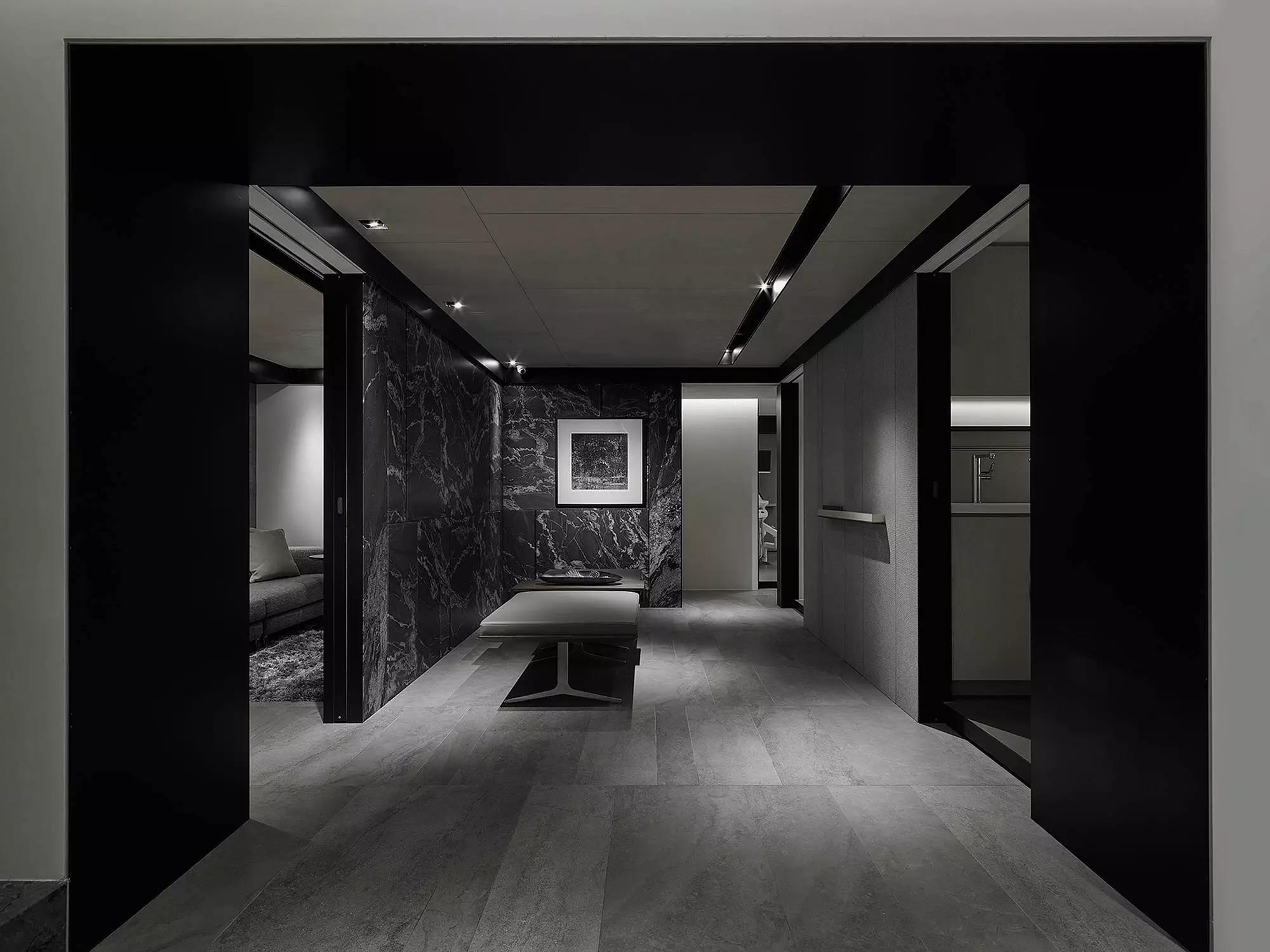 將玄關(guān)刻意退縮于室內(nèi)、入口大門轉(zhuǎn)向,而產(chǎn)生一進(jìn)一景之空間體驗(yàn)層次,寬闊的騎樓面積與門口的虛空間,未踏入空間卻已感受沈穩(wěn)安定。